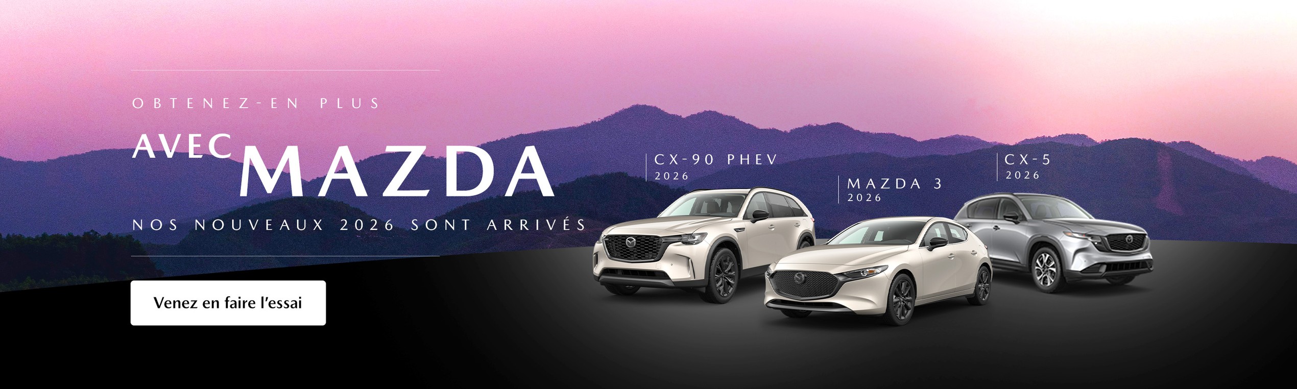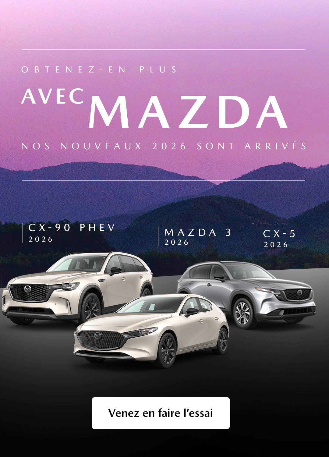 Si vous êtes à la recherche d’un VUS Mazda, vous aurez l’embarras du choix parmi nos différents modèles neufs et d’occasion. Du compact mais polyvalent CX-30 neuf au populaire Mazda CX-5 2025, en passant par l’élégant et spacieux CX-90 PHEV 2025 et ses 3 rangées de sièges, la gamme de VUS que vous trouverez chez votre concessionnaire Mazda répondra aux besoins de chaque acheteur. De plus, ne manquez pas de jeter un œil à nos CX-3 usagés et à nos CX-5 d’occasion!